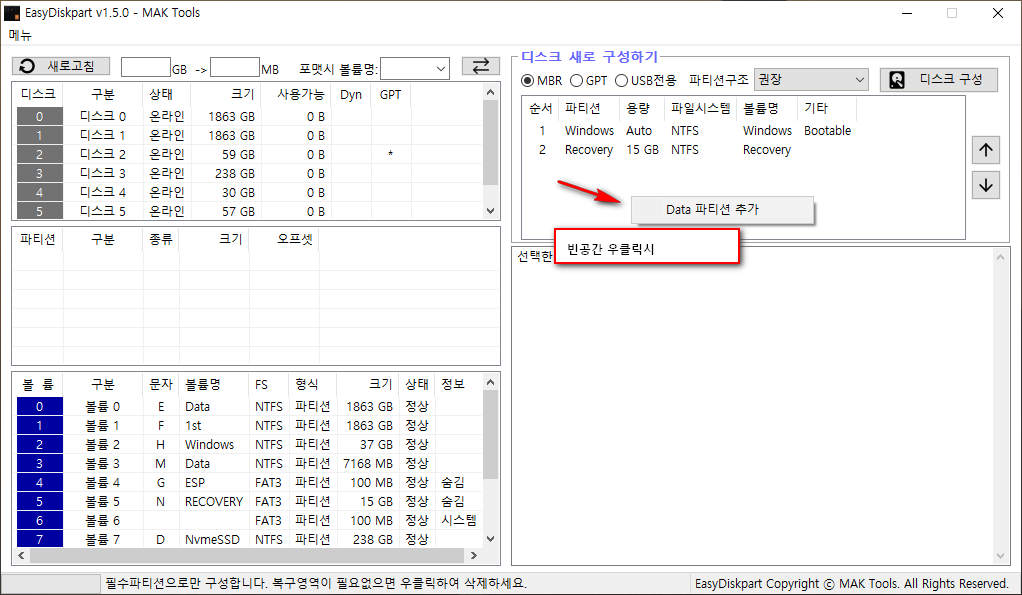 윈도우 파티션과 데이터 파티션으로 나누어쓰고 싶을 경우에는 빈공간에 우클릭하여 DATA 파티션을 추가해줍니다.