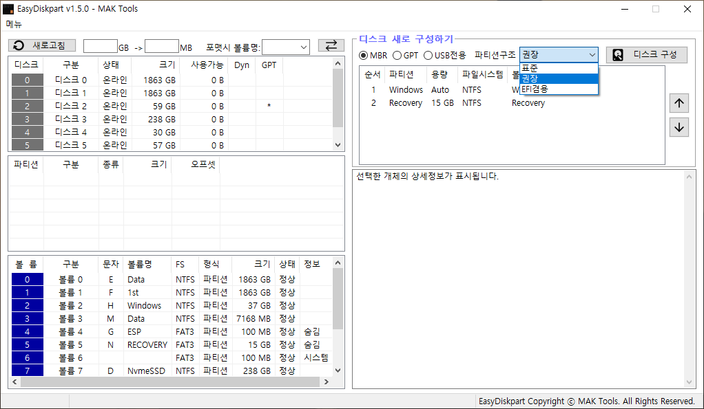 디스크 새로 구성하기 기능을 추가했습니다.