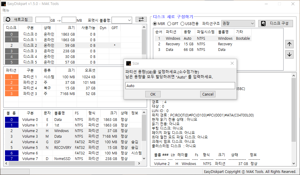 윈도우 파티션과 데이터 파티션은 AUTO로 지정할수 있는데, 남은용량을 모두 할당해주므로 AUTO로 사용하기를 권장합니다.