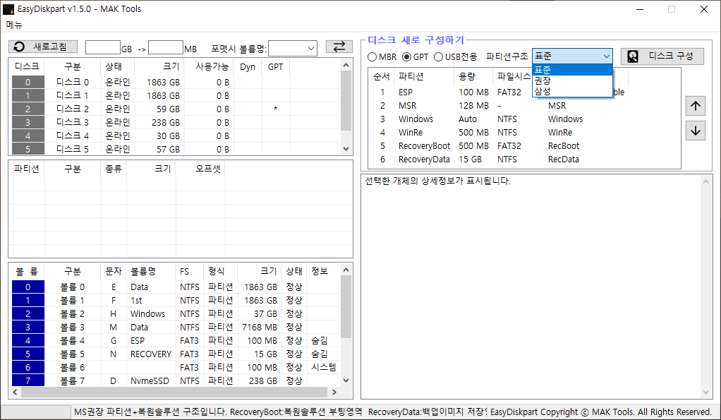 해당 디스크유형에 맞는 프로필이 자동으로 바뀌며 프로필을 선택하여 원하는 파티션 구조로 만들수 있습니다.