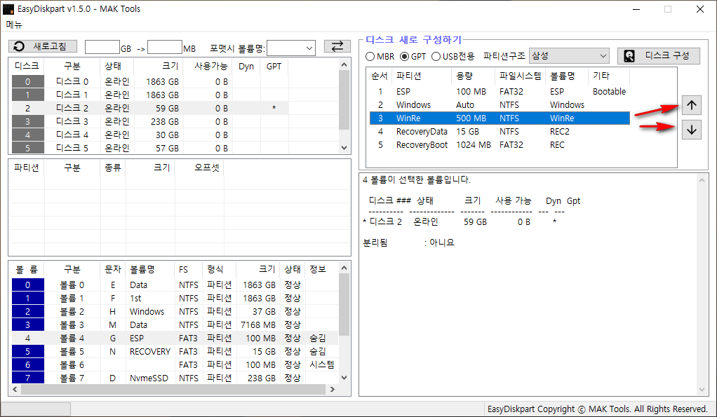 파티션 순서를 바꾸고 싶으면 선택후 화살표를 눌러 이동시켜줍니다.