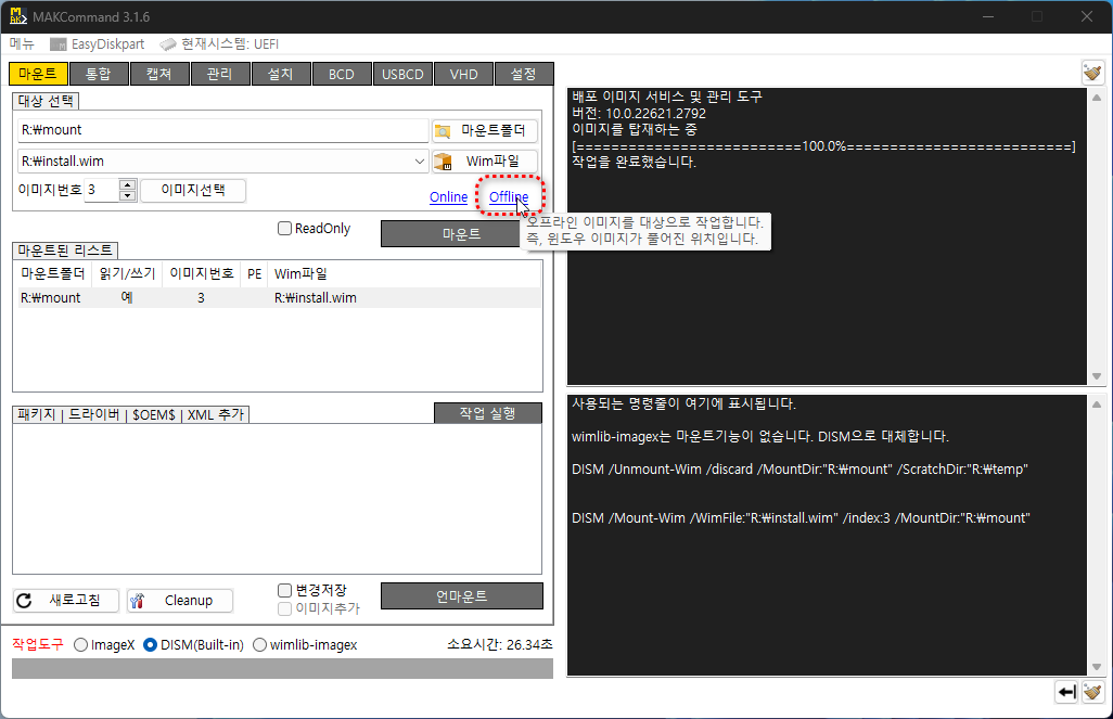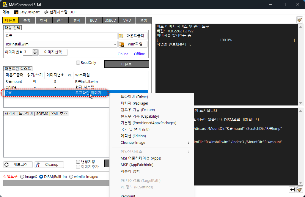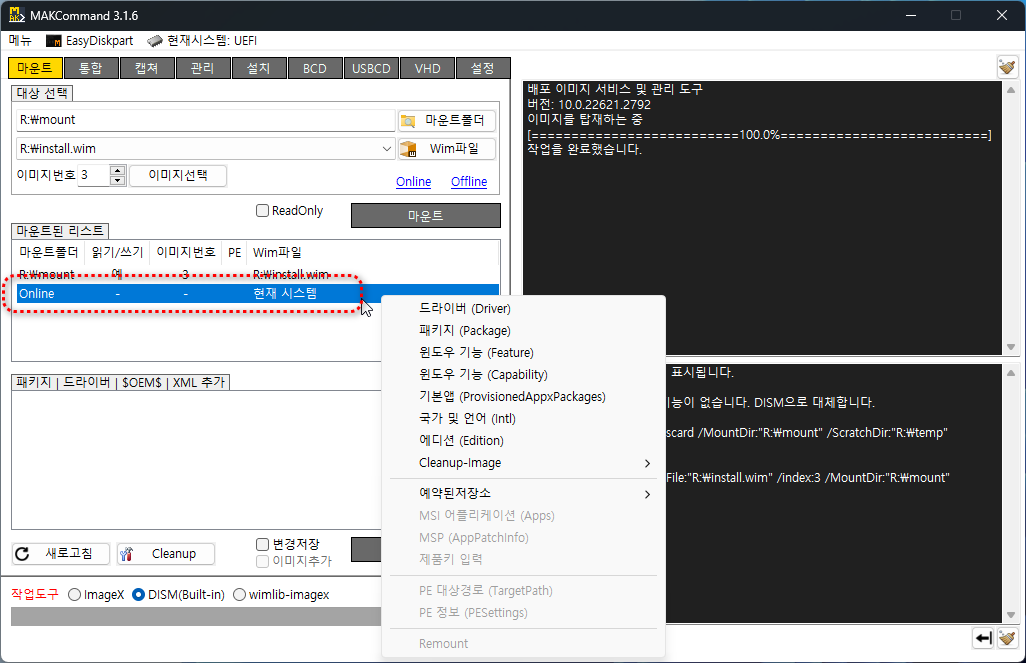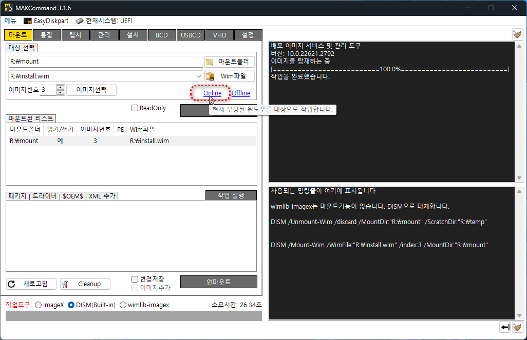 - 현재부팅된 윈도우를 대상으로 지정 (실제마운트는 아님)