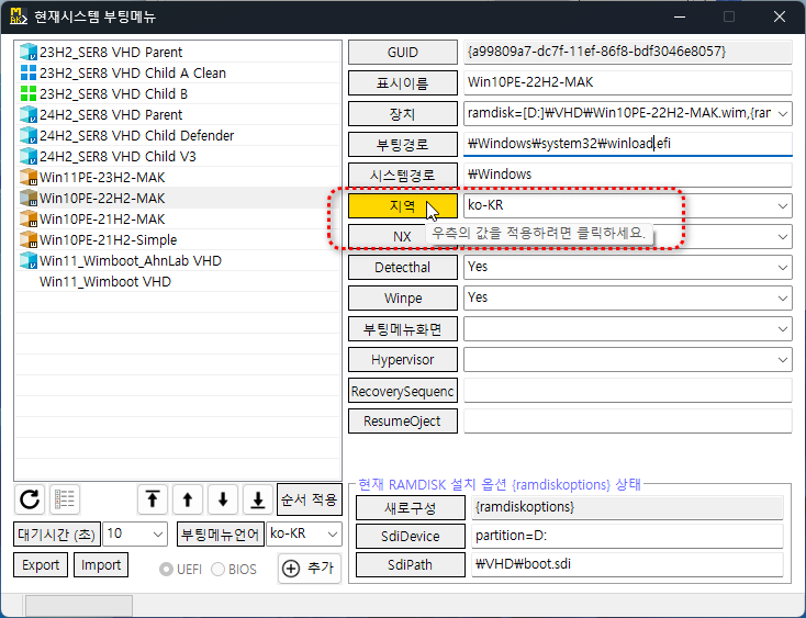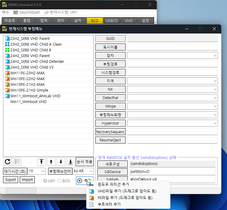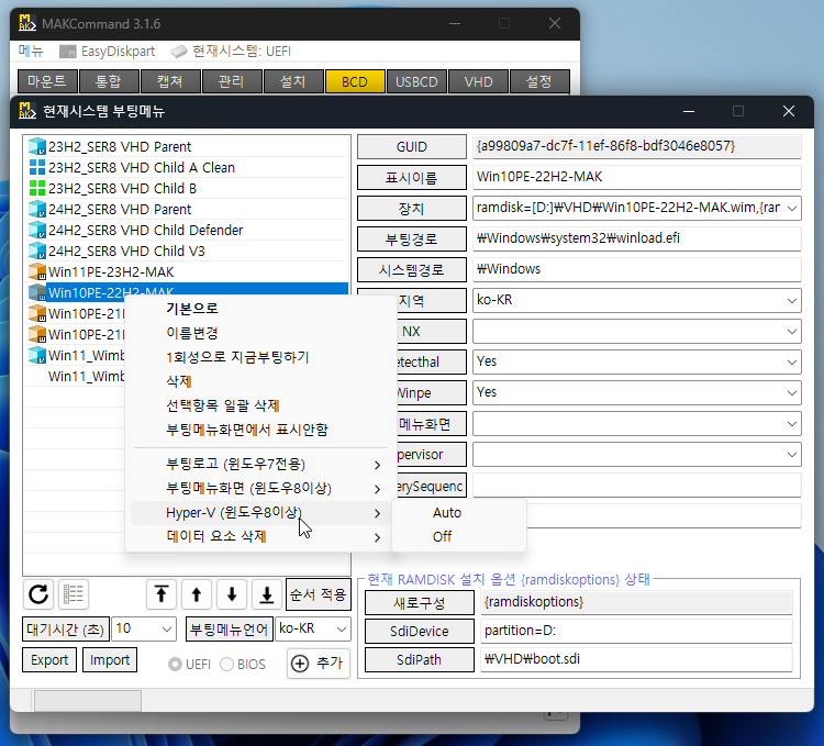 MAKCommand.exe /bootmenu 명령으로 부팅메뉴만 실행 (설정페이지에서 바탕화면 우클릭 레지추가)