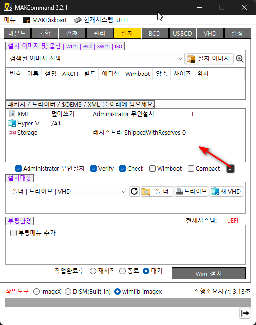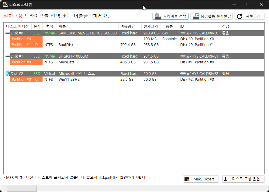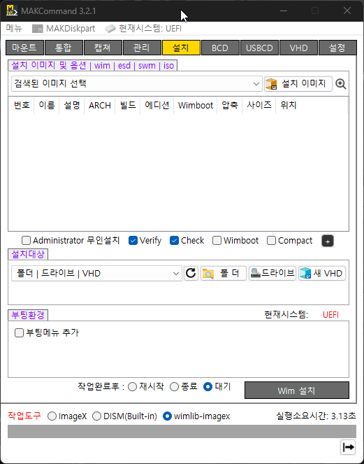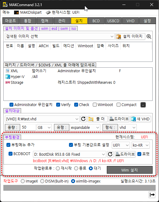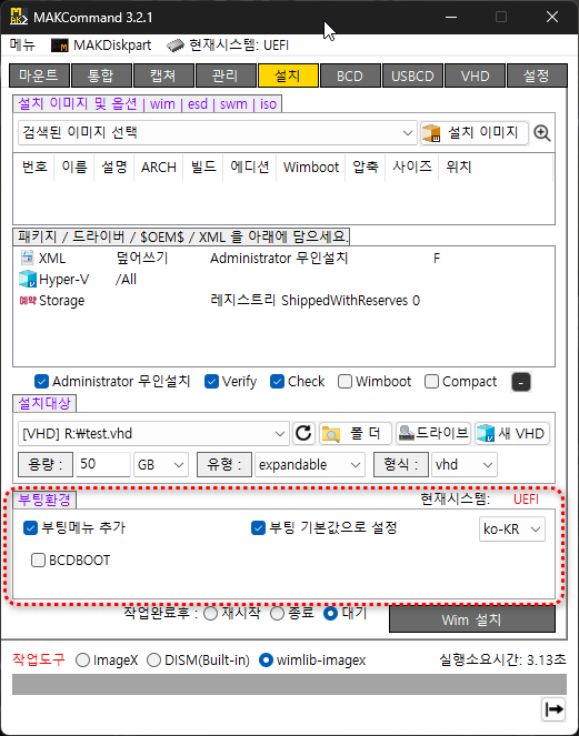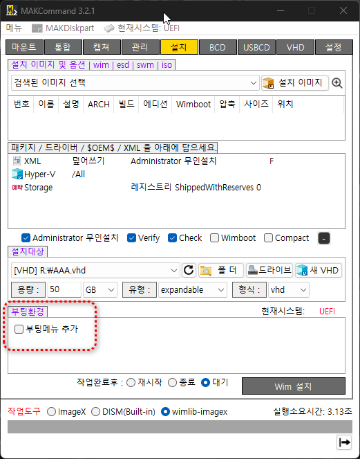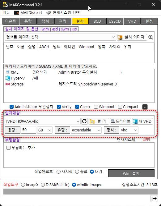 VHD : 신규 VHD를 생성하여 설치 원클릭. VHD크기나 유형은 설정페이지에서 설정한 기본옵션값 적용, 필요시 수정