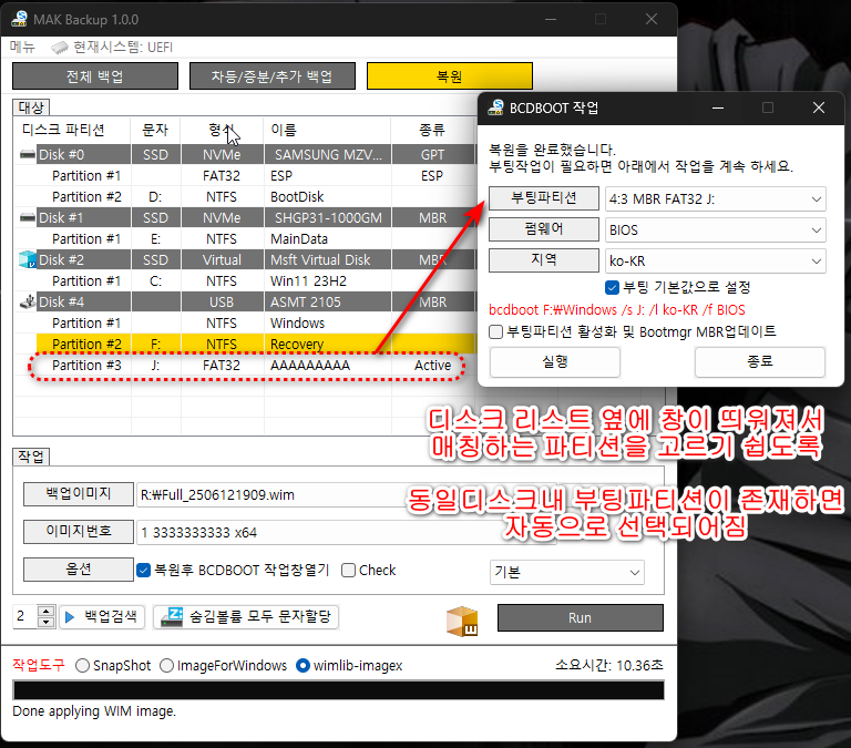 새디스크나 부팅파티션을 변경했을 경우 새로 부팅환경을 구성해주어야 하므로 이럴경우 BCDBOOT 작업을 해줘야 합니다.