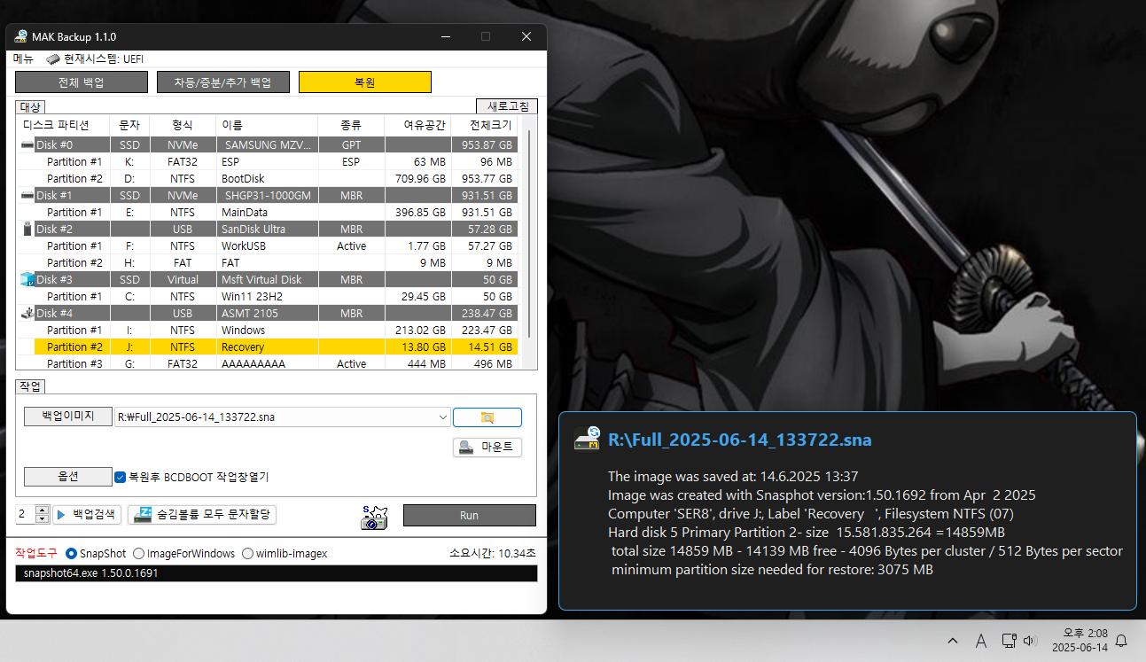 *백업파일 드래그시 자동으로 백업파일에 따라 복원 페이지로 전환되고 해당이미지파일 선택