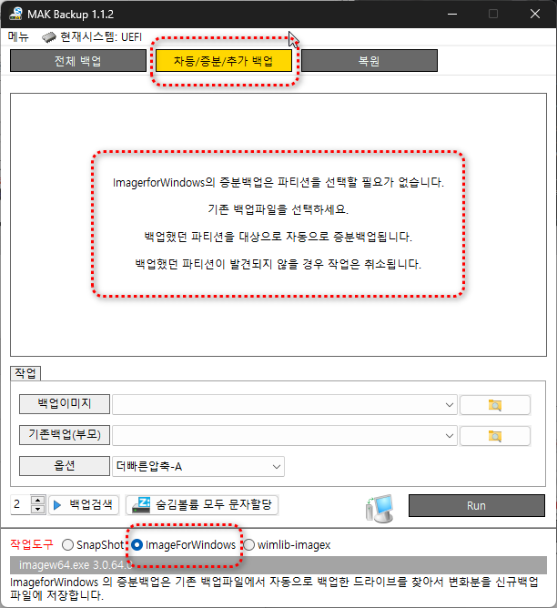 8. imageforwindows 증분백업 화면에서 파티션을 고를 필요가 없어서 그냥 삭제했는데 혼란을 주는것 같아 설명 추가