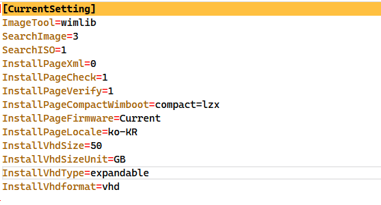 ini파일의 이해를 돕기위해 InstallPageCompactWimboot 값에 직접 옵션명을 적도록 세팅했지만 추후에는 단순히 옵션 순서대로 1,2,3,4,5 등으로 변경할 수 도 있습니다. 수정하기 편하도록..