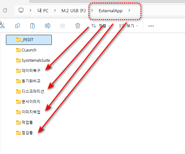 첨부스샷에서는 ExternalApp 폴더를 지정한 상태인데 저같은 경우에는 거기에 하위에 또 다시 종류별로 포터블 프로그램들을 모아놓습니다. 아래와 같이요.