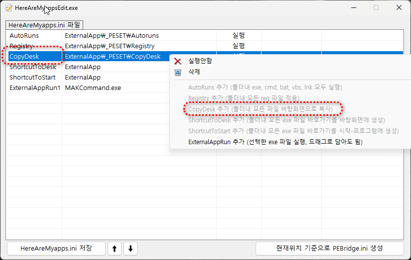 1. PE로 부팅하는 USB의 원하는 위치에 HereAreMyappsEdit.exe 파일을 위치시키고 실행합니다.