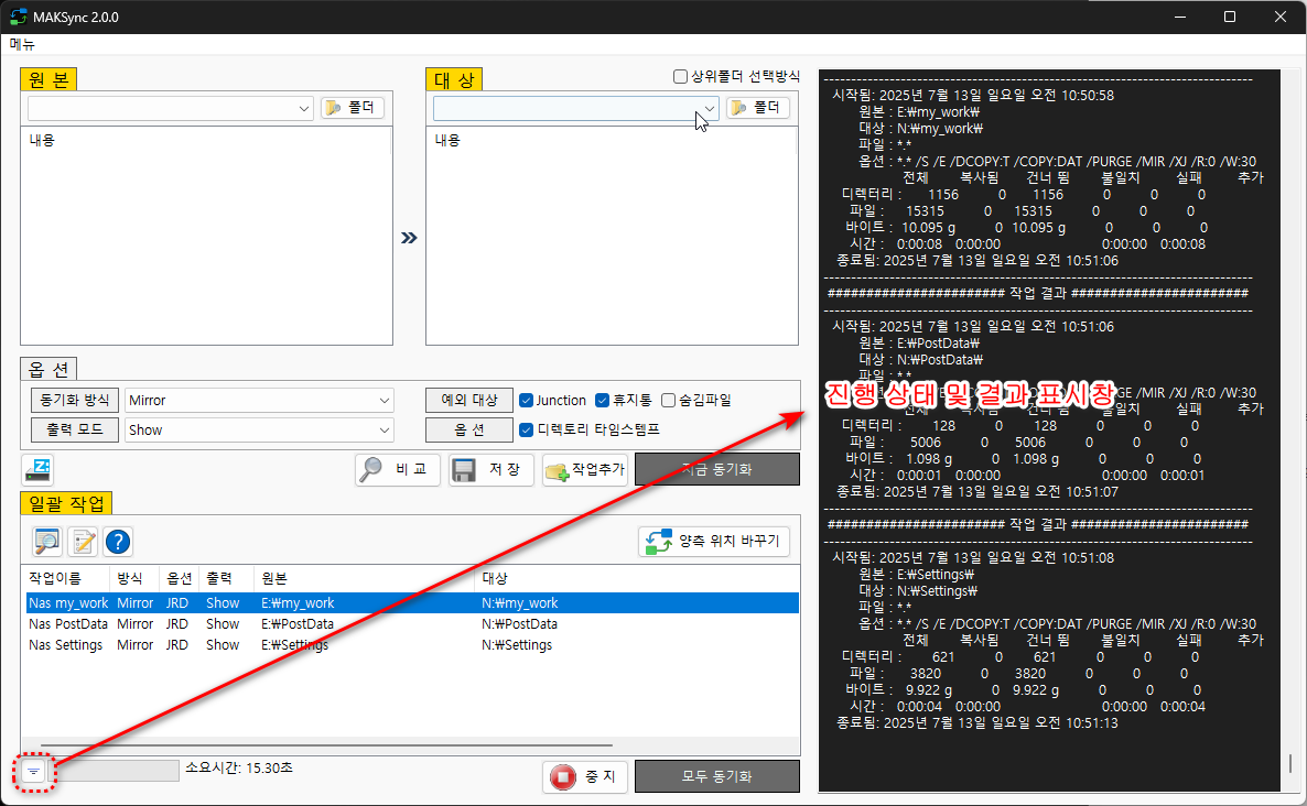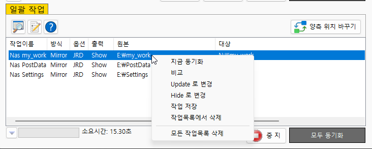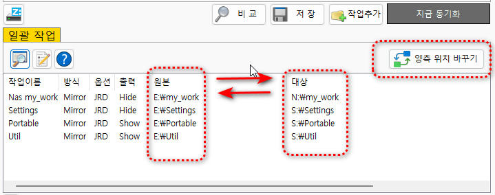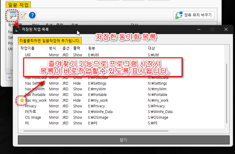 저장 : 다음에도 해당 작업을 할수 있도록 동기화목록 ini 파일에 저장됩니다.