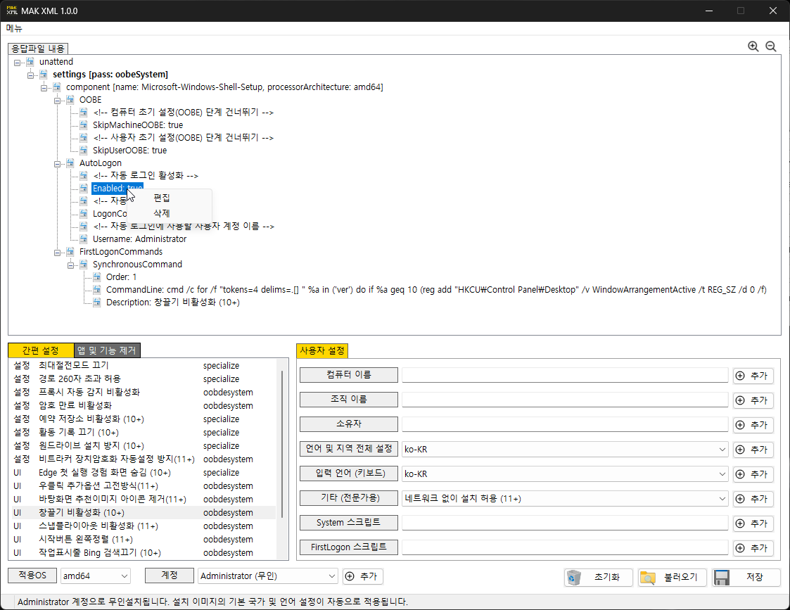 -로컬계정 (무인) -> 설정한 계정으로 무인설치