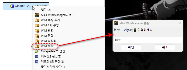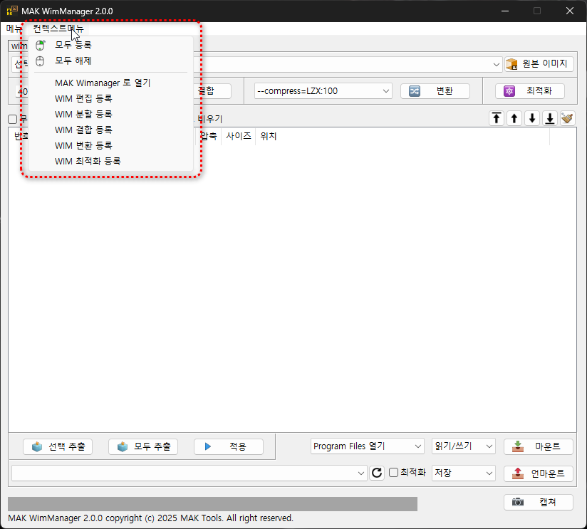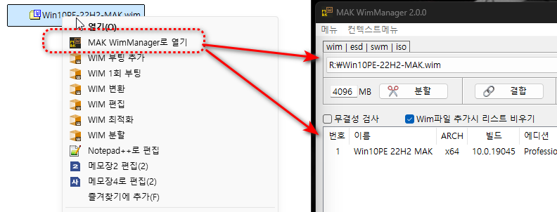 -이미 MAK WimManager가 실행중인 상태에서 " MAK WimManager로 열기" 실행시 해당 Wim파일 상단에 추가되며