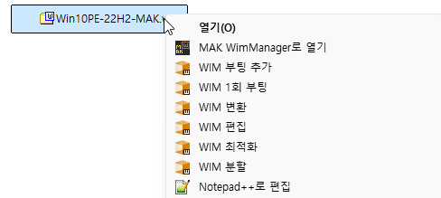 MAKBCD 2.2.0 의 Wim 우클릭 메뉴인 부팅추가 와 함께 사용시에는 아래와 같이 우클릭 메뉴 정렬이 이쁘지가 않음