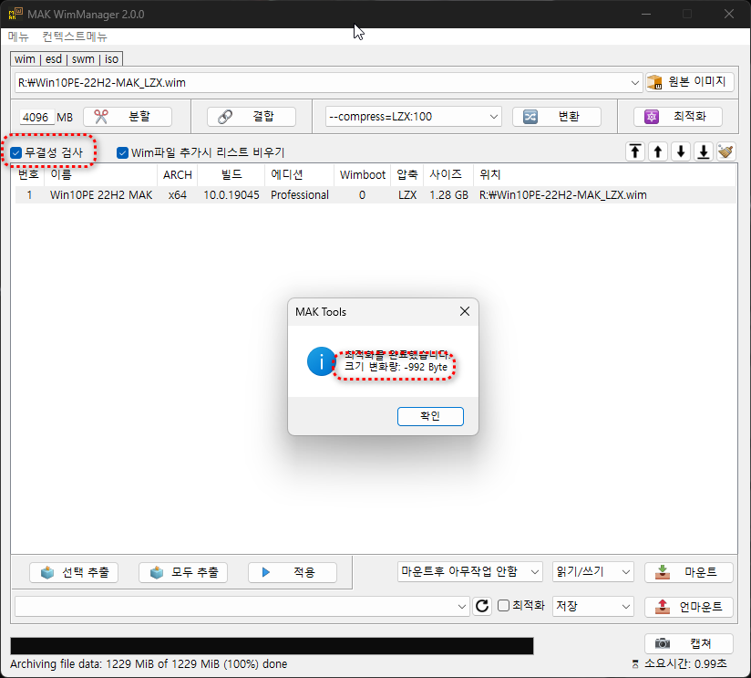무결성테이블이 없는 Wim 파일을 최적화시 무결성검사를 실행해서입니다.