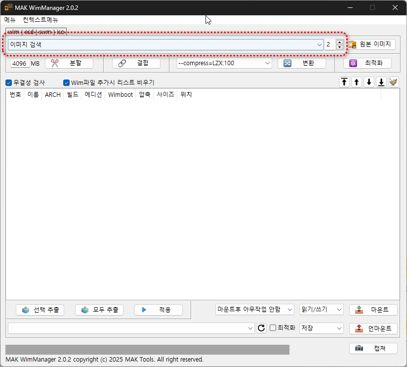 - 프로그램 시작시 자동검색은 의도적으로 배제, 작업하고자하는 Wim파일들만 추가해서 작업 편의성 높이려는 의도